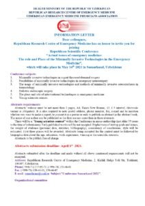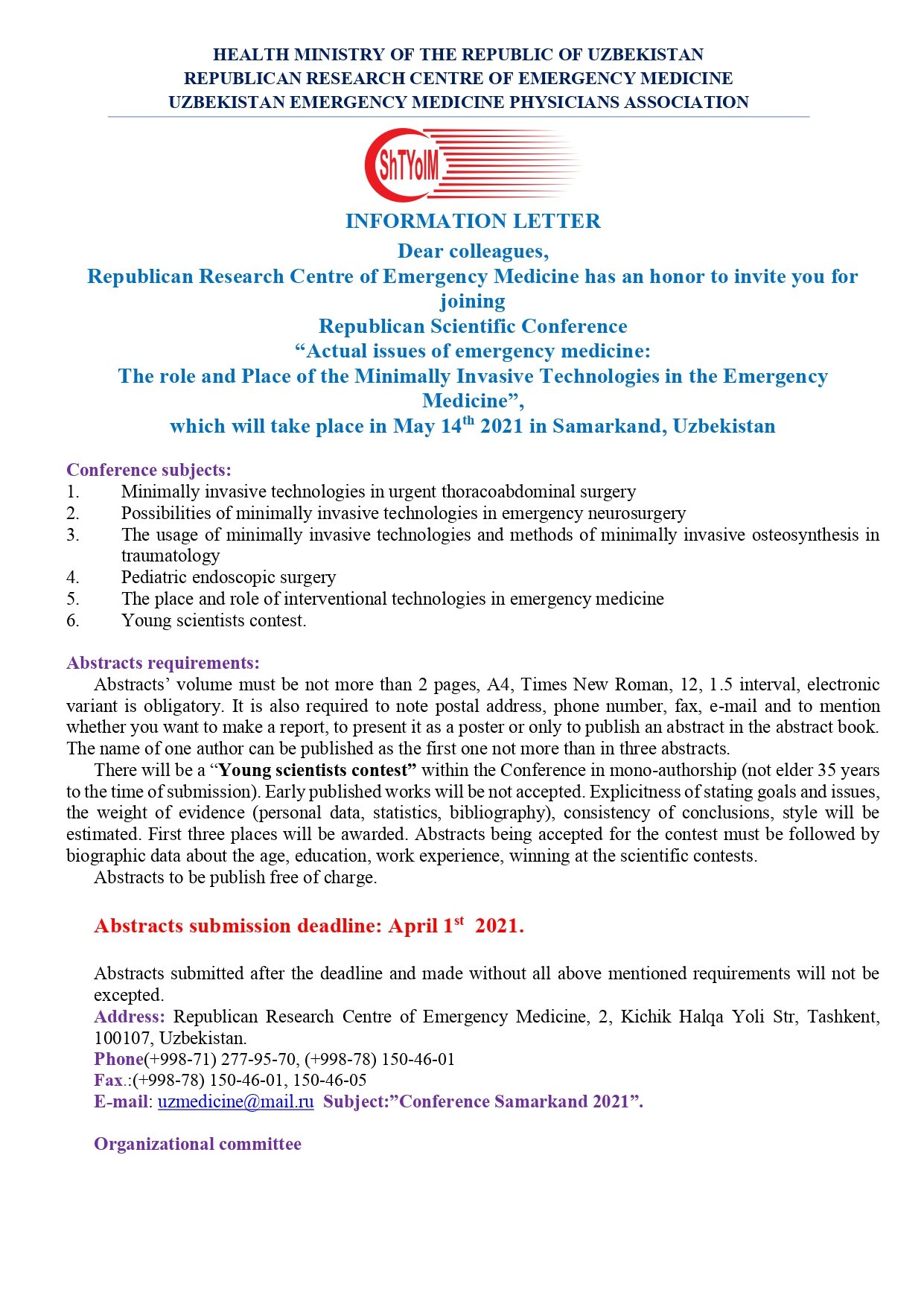 [:az]14 May 2021-ci il tarixində Özbəkistanın Səmərqənd şəhərində “Actual issues of emergency medicine: The role and Place of the Minimally İnvasive Technologies in the Emergency Medicine” tədbiri baş tutacaq. Azərbaycandan bizim rəhbərliyimiz ilə Azərbaycan Minimal İnvaziv Cərrahlar Cəmiyyəti və Azərbaycan-Alman Tibb Cəmiyyətinin nümayəndə heyyəti də bu tədbirdə iştirak edəcək. Maraqlananlar tezislərini əlaqə adressimizə (invazivm@gmail.com) göndərə bilərlər. Son tarix 1 apreldir.